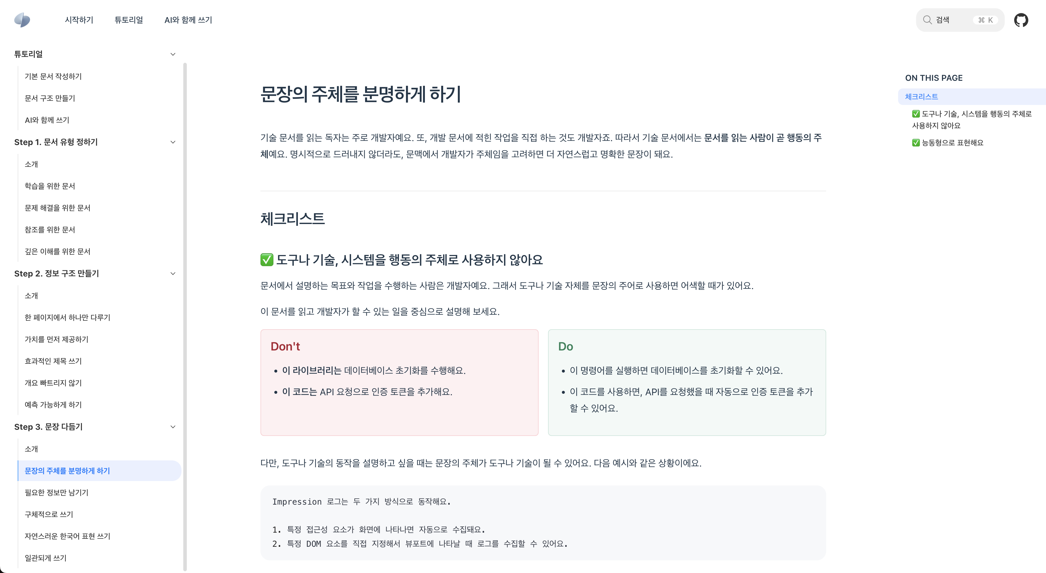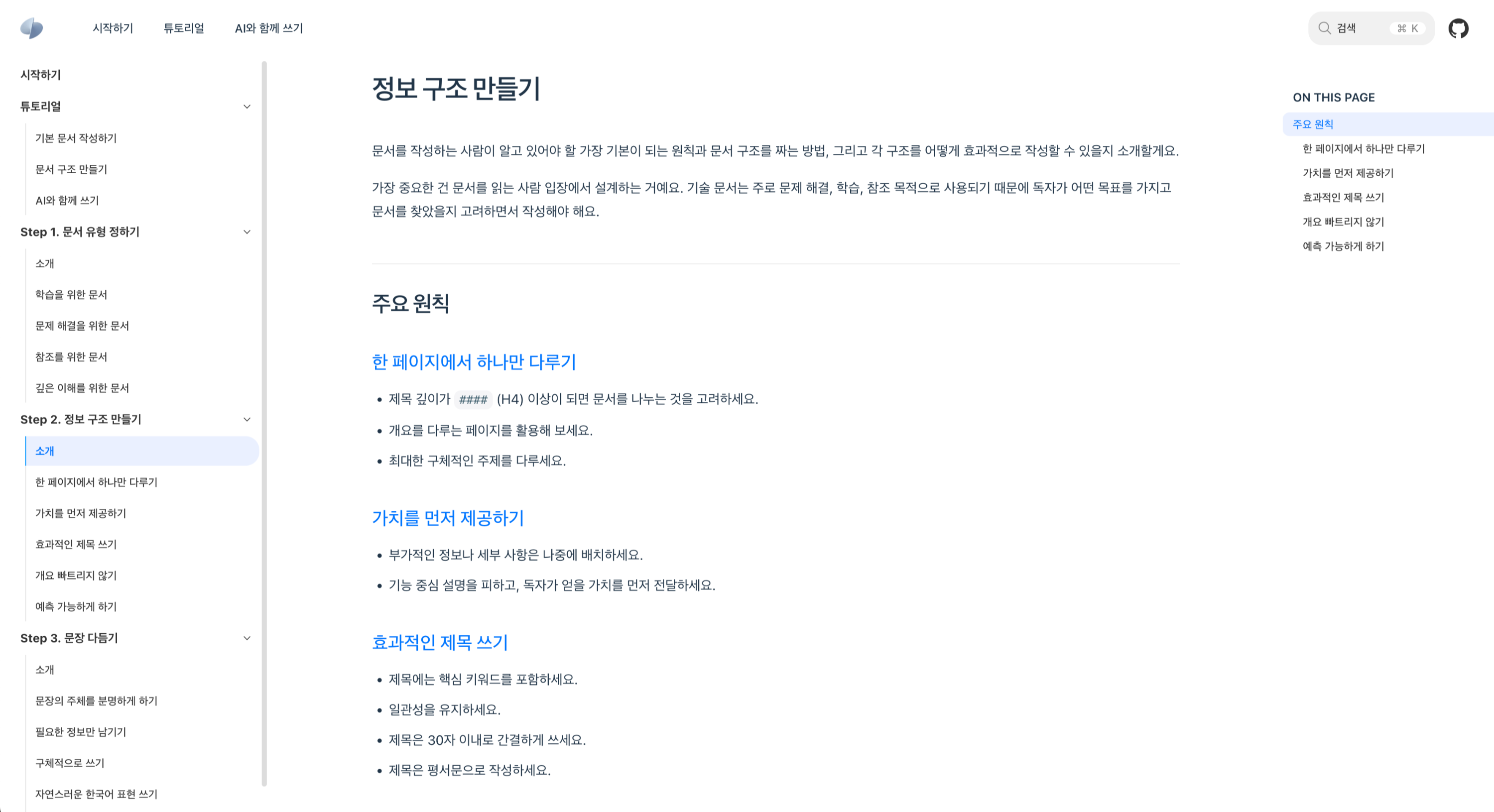 메인 화면은 위와 같으며, 아래의 '문서 유형 정하기', '정보 구조 만들기', '문장 다듬기'가 테크니컬 라이팅 가이드의 주된 내용이다.